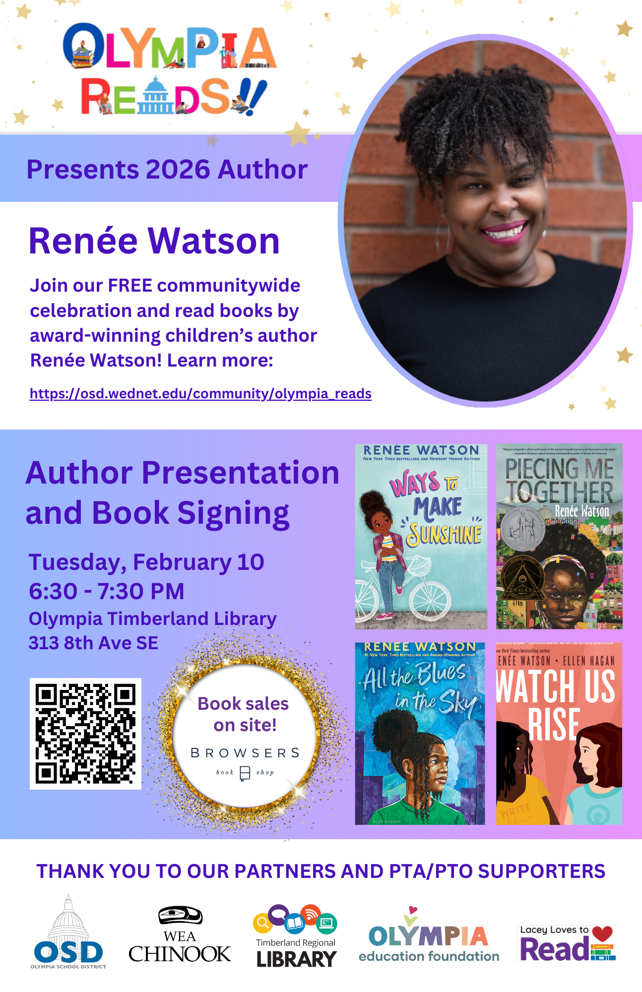We are pleased to sponsor Olympia Reads!! again. And we're even more excited to welcome this year's guest author Renee Watson, who earlier this week won the 2026 Newbery Medal for best children's book for "All the Blues in the Sky." We hope you'll join us for her free presentation and book signing at 6:30 p.m. on Tuesday, Feb. 10 at the Olympia Timberland Library. Her books will be for sale at the event.